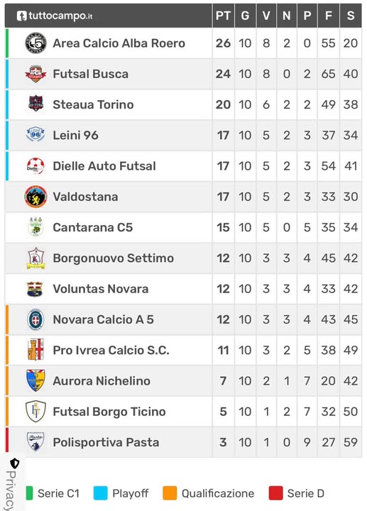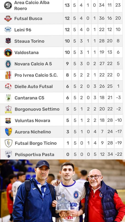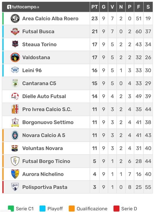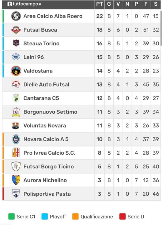 Sugli altri campi, il Cantarana fatica lontano dalle mura amiche e cede il passo al Dielle: i torinesi vincono e convincono con un netto 5-2. Infine, fuochi d’artificio nel derby della cintura torinese: Leini e Borgonuovo Settimo si dividono la posta in palio con uno spettacolare 4-4. In foto, la classifica aggiornata.